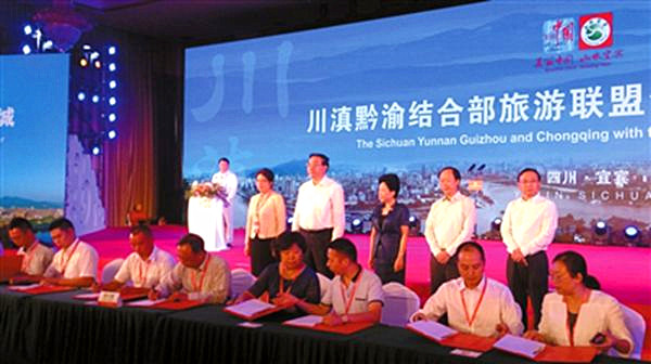 開幕式剛剛結(jié)束,川滇黔渝結(jié)合部旅游聯(lián)盟推介會暨旅游產(chǎn)業(yè)項(xiàng)目簽約儀式就成為各方關(guān)注的焦點(diǎn)。四川省宜賓、瀘州、自貢、內(nèi)江,貴州省遵義、畢節(jié),云南省昭通,重慶市江津區(qū)等8個(gè)市(區(qū))旅游部門的代表向參會嘉賓介紹了各自的旅游資源和旅游產(chǎn)品。